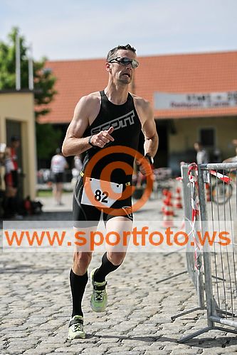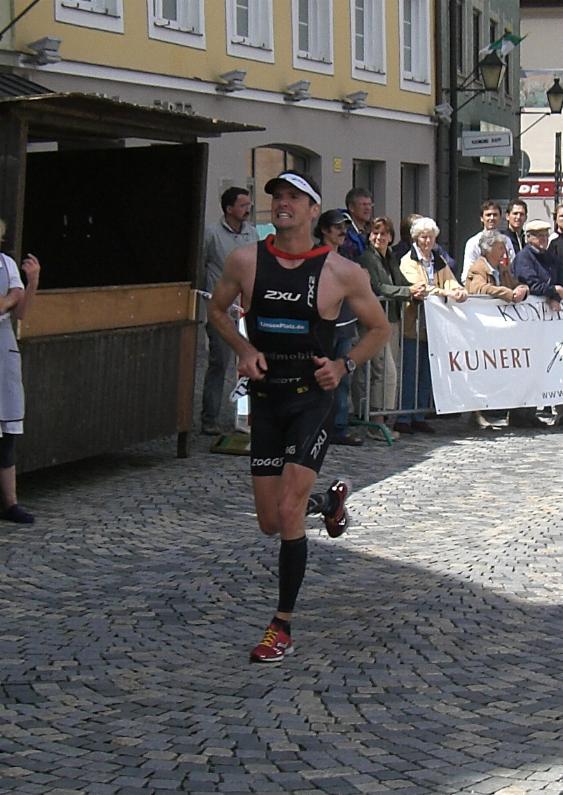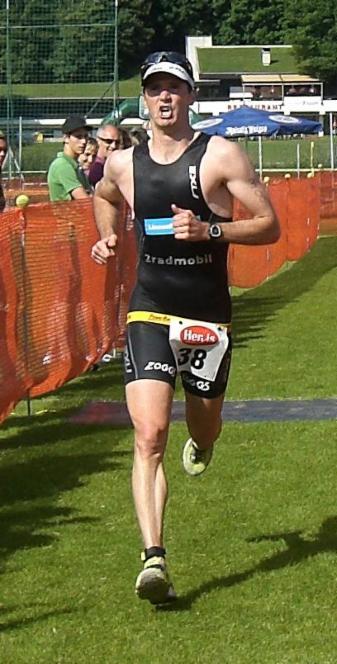 So endlich auf dem Rad und so schnell wie möglich Schuhe anziehen, bloß schlecht wenn die Schuhschlaufe ausgefädelt ist und man sie so nicht festziehen kann (dritte Schrecksekunde). Irgendwann, nach einem Balanceakt war auch das geschafft und die Jagd begann. Die ersten zwei Athleten wurden mit ziemlich viel Wut im Bauch über meine eigenen Fehler, dann relativ schnell aufgesammelt und überholt. So lag ich dann schon auf Platz 4. Die Beine waren gut, wahrscheinlich auch durch die schockierenden Schrecksekunden und ich konnte weiter mächtig Druck machen und sah bald die beiden nächsten Athleten vor mir. Auch die konnten nicht mitfahren und ich lag dann schon auf Platz zwei und somit auch in den Preisgeldrängen. Was ich zu diesem Zeitpunkt nicht wußte, daß Bernhard Schad führte der schon vor zwei Jahren in Köbrunn eine super Radzeit gefahren ist. Der Abstand nach hinten wurde immer größer und ich konnte so mit gutem Vorsprung als 2platzierter zum Laufen wechseln. Das ich sicher auf Platz 2 liegen würde, wußte ich nicht, da aufgrund der vielen Startgruppen auch schnell mal jemand übersehen wird. Der Wechsel in die Laufschuhe ging wieder recht gut.