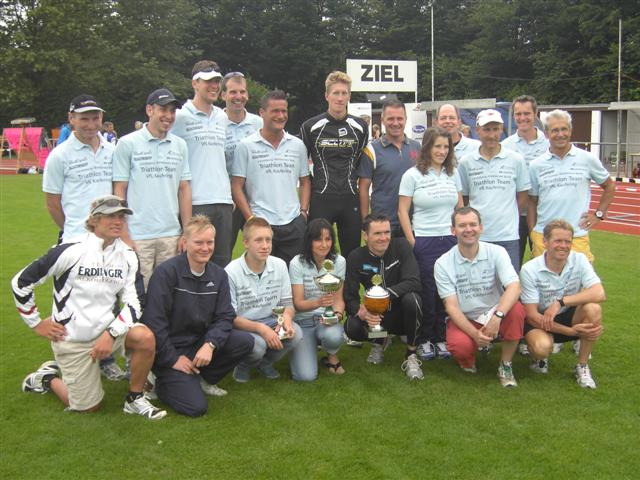Beim Schwimmen konnten wir mit einer Zeit von 14:45 über die 1000 Meter doch sehr zufrieden sein, da wir alle nacheinander auf der gleichen Bahn aus dem Wasser stiegen und mit einem schnellen Wechsel auch noch einige Plätze gutmachen konnten. So ging ich als 14ter fast gleichzeitig mit meinen Mannschaftskollegen auf die Radstrecke. Schon nach den ersten Kilometern wurde mir aber klar, das kein Druck da war und ich verpasste auch eine starke Gruppe die meine anderen drei Mannschaftskollegen alle noch erwischten. So fuhr ich alleine hinterher und kämpfte vergebens um den Anschluß. Trotz Einzelfahrt konnte ich noch vier Atlethen einsammeln, die das hohe Tempo der Gruppe nicht mitfahren konnten und nacheinander wegplatzten. So ging ich als 12ter auf die Laufstrecke, nachdem der Wechsel zum Laufen auch nicht optimal lief. Gleich auf dem ersten Kilometer, bekam ich dann heftige Magenkrämpfe, vermutlich hatte ich mich wohl beim Radeln dann ein bißchen übernommen. Auf jeden Fall konnte ich nur noch dahin schleichen und wurde nach hinten durchgereicht und kam so als 27ter mit einer 42er Laufzeit (ohne Worte ...) über die Ziellinie. Mit einer normalen Saison-Laufleistung, wäre an diesem Tag wohl noch ein Platz deutlich unter den Top Ten drin gewesen, ist zwar schade aber ich konnte mich dann dennoch freuen, denn Luke mein Mannschaftskollege hatte einen super Wettkampf und lief noch bis auf Platz 1 vor und wurde Deutscher Polizeimeister gegen starke Konkurenz. Steffen und Pierre kamen auch noch unter die ersten 10 und die Bayerische Mannschaft wurde dadurch auch noch Deutscher Mannschaftsmeister, sowohl bei den Herrn als auch bei den Frauen., ein riesen Erfolg für unser bayerisches Team.