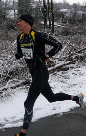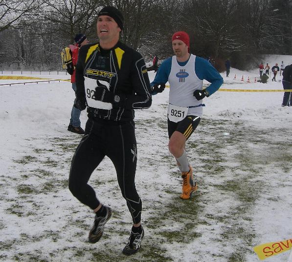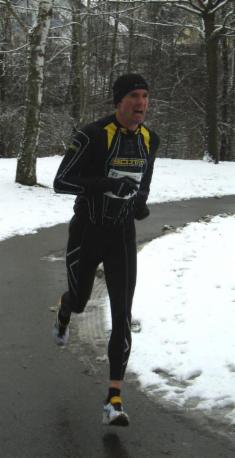 Aufgrund der engen Kurven und dem rutschigen Belag, gab es dann noch eine kleine Schrecksekunde, da ich mir den rechten Fuß vertrat, zum Glück ist nichts passiert. Ende der dritten Runde hatte ich ein kleines Tief, vielleicht auch aus Schock über den Fehltritt und ich mußte zwei Läufer ziehen lassen, was mich später den Sieg in der Altersklasse kostete. Aber ich war trotzdem gut unterwegs und konnte zum Schluß wieder zulegen. Jo Meier Kumpel und Vereinskollege war auch gut unterwegs mußte sich aber ohne Spikes auf die schwierige Strecke wagen und verlor so auch wichtige Sekunden im Kampf um die Plätze.