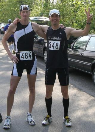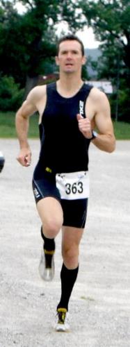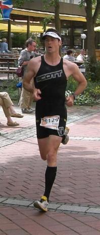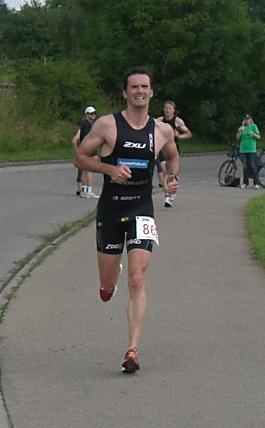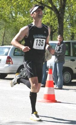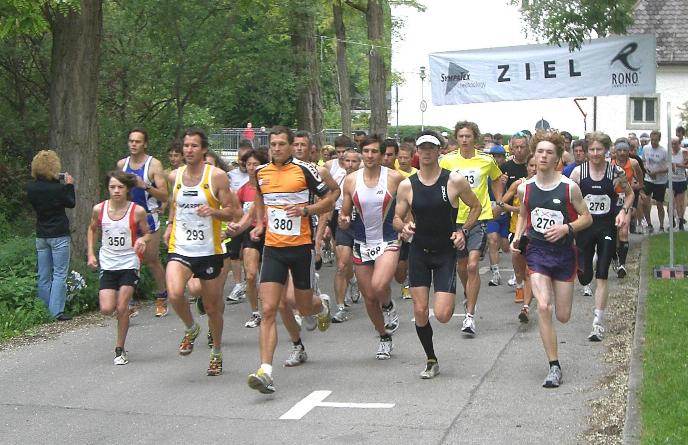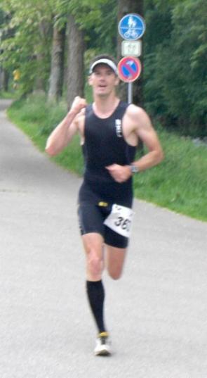 Aber nun zum Rennen: Nach dem Startschuß formierten wir uns gleich vorne mit ein und liefen hinter Thorsten Kriependorf einem Laufspeziallisten der zur Baden-Würtembergischen Spitze zählt (10000m Bestzeit 31:03, Halbmarathon 1:08) erst mal sein Tempo mit und der erste Kilometer ging verhalten mit 3:25 durch. Bei Kilometer 2 verschärfte Kriependorfer für ca. 20 Sekunden ordentlich das Tempo deutlich unter 3:25 und ich ging ein bischen mit, mußte aber dann rausnehmen um nicht zu platzen (waren ja erst 2 Kilometer gelaufen !!!) und die Lücke von ca. 20 Metern war auch gleich da. Nach hinten zu Henry der auf Platz 3 lag riss auch gleich eine Lücke und ich lief erstmal bis Kilometer 4 alleine auf Platz 2. Beim dann folgenden Anstieg machten sich dann die Beine schon stark bemerkbar und ich verlor ein bischen an Tempo, wobei Henry immer mehr aufschloß. Bei Kilometer 6 in einem Waldstück ging es auf einer langen Geraden leicht bergab und wir liefen Seite an Seite und kein Meter wurde dem anderen geschenkt die Führung wechselte ständig, an Aufgeben war nicht zu denken. Bei Kilometer sieben setzte ich dann mal wieder alles auf eine Karte und zog an Henry vorbei, dieser ging sofort mit und ich erhöte das Tempo noch ein bischen, Henry ging wieder mit, schon fast kurz vor dem Spurt erhöhte ich nochmal das Tempo und ich hörte dann einen lauten Stöhner hinter mir und Henry ließ endlich abreißen :-) die Pulsfrequenz hätte ich zu diesem Zeitpunkt nicht sehen wollen aber die Taktik ging auf. So konnte ich noch ca. 30 Sekunden bis zum Ziel herauslaufen und belegte vor Henry den 2 Gesamtplatz in einer für mich sehr guten Zeit von 38:56. Thorsten Kriependorfer gewann überlegen in einer Zeit von 36:34 (3:12 pro km), eine wahnsinns Zeit, wenn man bedenkt das wir auch nicht gerade mit einem Kilometer/Schnitt von 3:24 gebummelt sind. Die Laufform sitmmt, jetzt muß in den nächsten zwei Wochen noch an den anderen zwei Disziplinen gearbeitet werden. Also bis bald Gruß Tom...