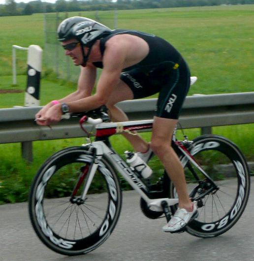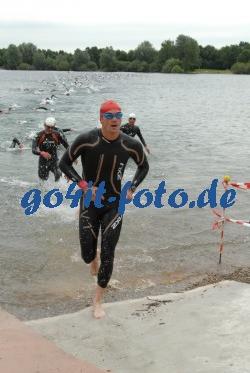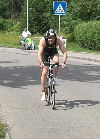 Mit Ulli Nieper und Daniel Müller waren zwei starke Athleten am Start. Das Schwimmen gestaltete sich überreaschend gut, da ich ordentlich Druck in den Armen hatte und ich neben Ralf meinem Vereinskollegen während der gesamten Scwimmstrecje mithalten konnte am Ende konnte ich sogar kurz vor Ralf aus dem 19 Grad warmen Wasser steigen und hatte so zur Spitze nicht allzuviel Rückstand obwohl Daniel Müller (Profi mit 1500m Bestzeit von 17:10)bereits weit vor mir aus dem Wasser kam, so konnte ich auf Rang 7 aufs Rad steigen und die Verfolgung aufnehmen.