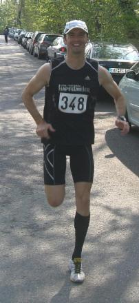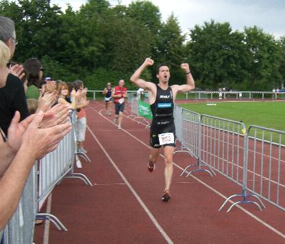 Beim Wendepunkt wurde dann der Gesichtsausdruck der vor mir platzierten genau gelesen und bis auf den späteren Sieger Jan Dieko und den zweitplatzierten, sahen die anderen zwei schon ein bischen angeschlagen aus und ich versuchte den Abstand nochmal zu verkürzen, doch bei Kilometer 16 krampften dann die Oberschenkel doch schon merklich und ich war eigentlich nur noch darauf aus, den Platz zu halten und endlich die langen Geraden im Wald hinter mir zu lassen. Beim letzten Anstieg über die Brücke, bekam ich die Info, daß der bis dahin viertplatzierte noch ca. 200 Meter Vorsprung hatte und noch ca. 1 Kilometer zu laufen war. Aber die Beine fühlten sich eher schlecht als recht an und als ich auf die letzte Gerade nach der Brücke in Richtung Stadion lief, sah ich den viertplatzierten in Sichtweite. Der Akku war schon deutlich im roten Bereich, doch der Abstand nach hinten zu groß um nichts mehr zu riskieren und so nahm ich nochmal die Beine in die Hand und gab noch mal alles was die Beine hergaben und der Abstand wurde immer geringer. 400 Meter vor dem Ziel schloß ich dann auf und ging auch sofort vorbei, doch der viertplatzierte gab sich noch nicht geschlagen und gab nochmal Gas so mußte ich nochmal (ich weiß bloß nicht mehr wie, die Sternchen wurden immer gelber) einen drauf setzen und erst dann ließ der Verfolger endlich abreißen und ich konnte mit einem Gang weniger als Gesamt viertplatzierter überglücklich die Zielline überqueren (Siehe Bild ganz oben) und wurde auch noch mit ein paar Euronen mehr Preisgeld belohnt. Mit einer Zeit von 3:45 lag ich nur knapp, bei optimalen Bedingungen über dem Streckerekord vom letzten Jahr.