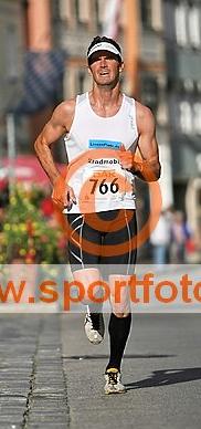 Die ersten Laufkilometer ging ich gleich flott an um den Abstand so schnell wie möglich zu verkürzen denn ich fühlte mich gut und riskierte einfach wieder, mit der Gefahr daß es natürlich in die Hose geht. Zwei Polizei-Kader-Kumpels Luke und Mirco (Von hier aus nochmal herzlichen Dank für die tolle Unterstützung !!!) aus dem Frankenland hatten sich auf der Brücke postiert und gaben mir ständig die Abstände durch und Conny nahm kurz vor dem Stadion Stellung und so war ich bestens informiert und wußte, daß ich mit meinem momentanen Lauftempo immer näher zu Platz 5 und 6 kam, die ungefähr eineinhalb Minuten Vorsprung hatten. Bei Kilometer 7 hollte ich dann Beide ein und ging auch gleich vorbei und lag somit schon auf Platz 5.