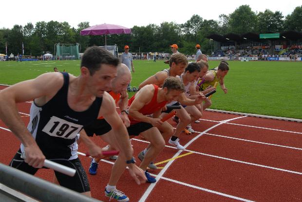 Eine Stunde später fiel bei der Bayerischen Mannschaft kurzfristig noch ein Läufer für die 3x1000 Meter Staffel aus und ich erklärte mich bereit mitzulaufen sonst würde die Staffel nicht starten können. Eine Zeit unter 3:00 traute ich mir kurz nach dem 5000er Rennen dennoch zu und so kam es das ich als Startläufer (Rennschnecke) den Lauf in Angriff nahm. Die erste Runde mußte ich ziemlich kämpfen um überhaupt am letzten Läufer dran zu bleiben, denn die schlugen da ein riesen Tempo vor und die erste Runde ging ich mit 64 Sekunden an und verlor aber dannach immer mehr an Boden und kämpfte mich dennoch mit 2:50 und ca. 10 Meter Rückstand als letzter zur Übergabe. Ganz schön krass wenn man bedenkt, daß die schnellsten mit 2:30 wechselten, sind halt deutsche Meisterschaften und kein Volksevent. War trotzdem ein riesen Spaß und ein tolles Erlebnis, dabei gewesen zu sein.