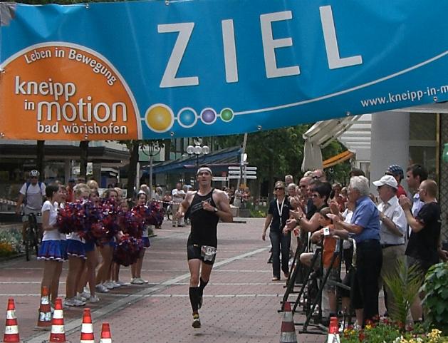 Die ersten zwei Laufkilometer gingen dann recht zeh, da auf der Radstrecke doch kräftig hingedrückt wurde, wohlwissend, daß noch ein starker Läufer von hinten kommen wird. Bei Kilometer 3 hatte ich mich dann gefangen und die Beine waren wieder da und Bernhard Schad schon in Sichtweite. Ich kam näher und konnte auch schnell vorbei gehen. Kurz vor dem Wendepunkt bei Kilometer fünf kam mir aber auch niemand mit einer roten Startnummer für unsere Startgruppe entgegen, so wußte ich daß ich wohl in Führung lag was mir auch ein Helfer dann bestätigte. So kam mir nach der Wende bei Kilometer 6 Thorsten Kriependorf mit 1:30 Minuten Rückstand entgegen und ich hatte noch 4 Kilometer zu laufen und ich dachte das könnte reichen zumal der Kilometerschnitt nicht zu langsam war. So konnte ich dann mit knapp 1 Minute Vorsprung vor Thorsten Kriependorf der mir auf der Laufstrecke doch noch 3 Minuten abnahm und Bernhard Schad den Erbacher Triathlon gewinnen und der Stationsprecher war sichtlich überrascht, daß ein Bayer in Baden-Würtemberg als erster über die Ziellinie rannte. Jetzt heißt es erstmal erholen, denn ich bin doch ziemlich geplättet und habe alles gegeben, bin gespannt ob ich noch zu guten Leistungen im Stande bin,denn das Programm war bis jetzt doch ziemlich hart und ist auch noch nicht zu Ende. Also bis bald und vielen Dank, daß ihr so oft und interessiert vorbeischaut weiter so, Reaktionen im Gästebuch sind immer willkommen :-) , Gruß Tom...