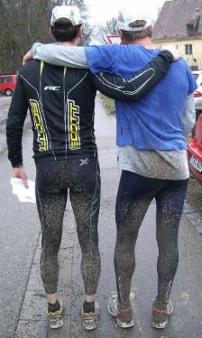 Die Runde war dreimal zu druchlaufen und war gleich nach dem Start zu allem Übel auch noch schneebedeckt, so daß etlich Läufer mit Spikes am Start waren. Wir natürlich nicht.... Gleich nach dem Start versuchte ich wenigstens ein paar kleine unbedeckte Wegflächen zu ergattern um nicht nur auf der Stelle zu treten. Gleich bei der ersten Bergabstrecke zogen wieder etliche Läufer an mir vorbei auch Maik war dabei. Da das Bergablaufen nicht zu meinen Stärken gehört, wird lieber jeder Schritt geplant und sicher aufgesetzt. Gleich beim nächsten Anstieg konnte ich wieder einige Läufer einsammeln und Tempo machen auch Maik wurde wieder eingeholt und überholt. Danach lief es richtig gut und die zweite Runde gestaltete sich ähnlich. Die Gruppen hatten sich gefunden und es gab keine unnötigen Überholmanöver mehr, die Rückseite der Läufer sah bei allen gleich aus und die Dreckspritzer reichten hoch bis zum Kragen.