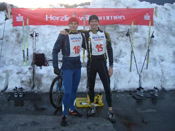 Bei herrlichem Wetter war nach der ersten Besichtigung der Wettkampfstrecke mit dem Mountainbike klar, daß der Wintertriathlon wohl ohne das Radfahren stattfinden würde. Der Schnee war aufgrund der Sonneneinstrahlung doch ziemlich weich geworden und das Vorderrad sank sobald man auf dem Rad saß sofort ein und man hätte mehr schieben als fahren können. So wurde kurzer Hand vom Veranstalter der Triathlon in einen Duathlon umgemünzt.