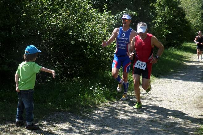 Auf der Laufstrecke lief es dann auch top und ich wußte erst wo ich in der 2. Startgruppe lag, als der Führungsradler in Sichtweite kam. Noch vor Ende der ersten Laufrunde kassierte ich den bis dahin Führenden der wohl schnell geschwommen sein muß, ein und baute meinen Vorsprung weiter aus. Coach Luca sorgte für genügend Motivation