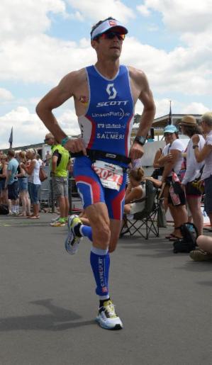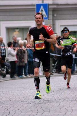 Beim Lauf hatte ich mir einen 4er Schnitt zurecht gelegt und wusste aber noch nicht, das auch die Laufstrecke alles andere als flach war. Auf der 5 Kilometer Runde waren drei lange kleine Anstiege eingebaut, die viermal zu bewältigen waren. Die ersten zwei Runden waren recht konstant und die Motivation stieg natürlich wenn man nur am überholen ist. Kurz vor Ende der dritten Runde war es dann soweit, der erste Läufer der mich überholt hatte war aber nur unwesentlich schneller. Festbeißen war leider nicht möglich, da sich im rechten Oberschenkel schon ein Krampf anbahnte. So war dann zum Schluss der Überholer ein Pole der mir natürlich noch in der M40 den zweiten Platz wegschnappte.