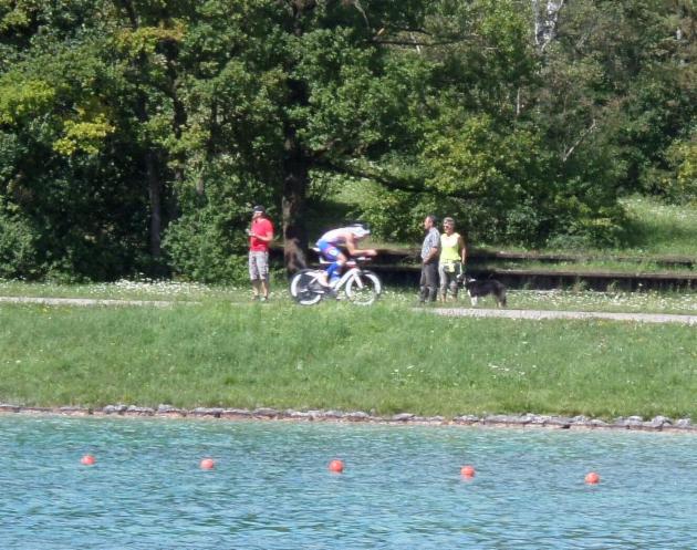 Aus den 800m Schwimmen wurde ein 5 Kilometer Lauf anschließend wurden noch 30 km geradelt und 7,5 km gelaufen. Der bayrische Polizeimeister Michi Ager schlug ein hohes Tempo in der ersten Disziplin an und lief den ersten km deutlich unter 3:30. Ich ließ eine kleine Lücke von ca. 20 Metern und konnte die ersten 5 km in einem 3:30er Schnitt hinter mich bringen und wechselte als dritter auf die Radstrecke. Gleich nach der ersten Runde konnte ich die Führung übernehmen und schaffte genug Abstand für den anschießenden Lauf zwischen mich und den zweitplatzierten.