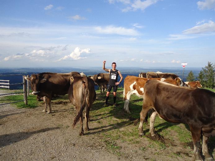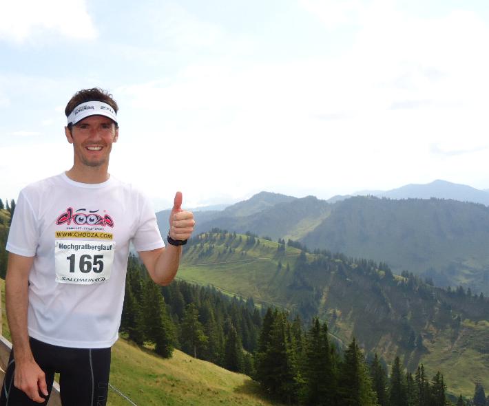 So setzte ich erstmal einen Schritt vor den anderen und zügelte mein Tempo, was nicht gerade schwer war, denn nach 50 Meter gings gleich die erste steile Rampe mit ca. 14 % nach oben. Nach ca. 2 Kilometer konnte ich dann Läufer für Läufer überholen und arbeitete mich langsam nach vorne und natürlich auch nach oben zum Hochgrat. Bei Kilometer 4 schon mehr als die Hälfte geschafft, nahm ich die erste und einzige Verpflegungstelle dankend an und konnte bereits weit oben über mir den Gipfel erblicken. Die letzten Meter vor dem Ziel waren dann nochmal extrem steil, doch dank der vielen Zuschauer(Wanderer/Betreuer) am Streckenrand verkniff ich mir die Gehpause und kämpfte mich über die Zielline, mit einer Zeit von 42:42 kam ich 7 Miunten hinter dem Sieger Stefan Paternoster vom Team Salomon ins Ziel.