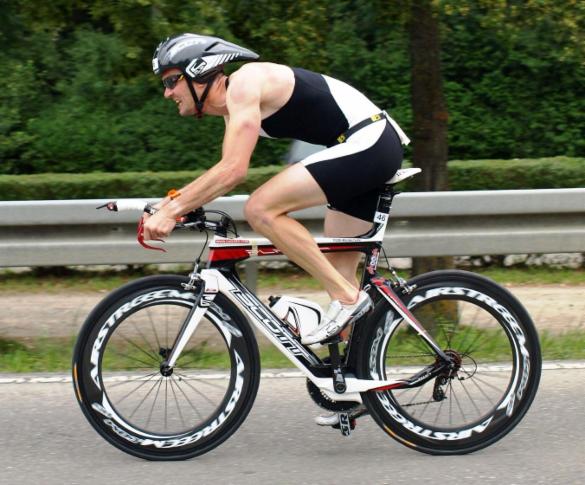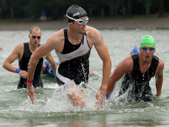 Gesagt getan ging ich diesmal beim Schwimmen von Anfang an volles Risiko und ließ mich erst garnicht auf ein gebummle ein um jegliche Erschütterung auf meine Füße zu vermeiden. So lag ich nach ca. 400 Metern mit ganz vorn (sauber überzogen) und nach der ersten Wendeboje führte ich die zweite Spitzengruppe an. Lothar Leder und Max Klumm meine späteren bezwinger waren derweilen schon weit enteilt und die Arme wurden auf der letzten geraden dann doch ganz schön schwer mit der zwölften Schwimmzeit ging es ab auf die Radstrecke.