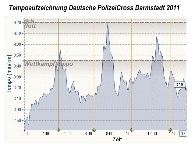 So hängte ich mich gleich nach dem Startschuß an seine Fersen. Mein Ziel war so lange wie möglich dran zu bleiben um wieder genügend Tempohärte zu sammeln zumindest auf den ersten 5 Kilometern. Schumi lief ein gleichmäßíges Tempo um die 3:20 was ich gut mitgehen konnte, einige Läufer diesmal nicht ich :-) versuchten kurz mal ein bischen anzuzupfen, welches Schumi wie schon beim Steineberglauf sofort konterte, ich verhielt mich ruhig und blieb einfach nur dran. Ab dem 3 Kilometer konnte nur noch ich folgen und wir liefen mit größer werdendem Abstand vor dem 3platzierten. Bei Kilometer 5 mußte ich dann doch reißen lassen da Schumi das Tempo mal kurz (laut meinem Garmin) unter 3 Minuten anzog. Bis dahin war ich dennoch gut dabei und die Formkurve für die 4400 Meter bei der Deutschen-Polizeimeisterschaft im Crosslauf zeigt weiter nach oben sofern die Quali geschafft ist. Weniger Umfang und mehr Tempo steht nächste Woche auf dem Programm, also bis bald Gruß Tom...