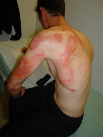 Im warsten Sinne des Wortes abgeleedert wurde ich bei meinem Sturz bei der Quali zur DPM im Triathlon an der Ruderregattastrecke in Oberschleißheim. Gott sei Dank zog ich mir dabei keine Brüche zu, aber der Rest ist leider auch nicht so toll (siehe Bild) nun heißt es erstmal wieder Fell wachsen lassen. Also bis bald Gruß Tom :-(