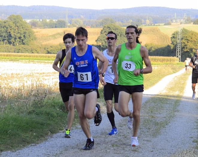 Um einen 3:30er Schnitt kämpfte ich in der ersten Runde in einer fünfköpfigen Spitzengruppe, zwei Läufer waren bereits enteilt, darunter ein Staffelläufer, beim ersten Anstieg konnte ich das Tempo ein bischen erhöhen und die Gruppe lichtete sich ein bischen. Kurz vor dem ersten Wechsel lag ich hinter Kumpel Hotte auf Platz drei, der in der zweiten Runde hinauf zum Ulrichsberg mächtig Druck machte. Mit einem schnellen Wechsel (ich hatte mich für die Laufschuhe auch auf dem Rad entschieden). Konnte ich Platz zwei übernehmen, wobei der führende schon deutlich enteilt war.