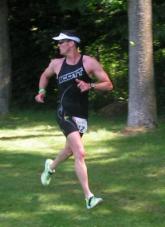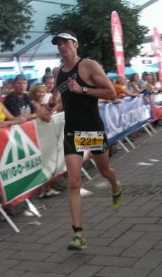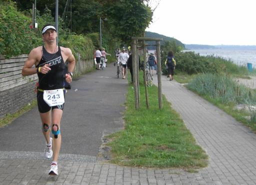 Ich ärgerte mich ziemlich über diese Entscheidung und trat deshalb noch heftiger in die Pedale und arbeitete mich weiter nach vorne, zur hälfte der letzten Radrunde zog ich sogar an Ulli Nieper vorbei und konnte noch über 2 Minuten auf ihn herausfahren. So fuhr ich als 11platzierter in die Wechselzone ein und ihrte erstmal total verwirrt in der Wechselzone herum und suchte den Radständer mit meiner Startnummer. Beim Rauslaufen aus der Wechselzone lief ich zuerst in die Penalty-Box und fragte nach ob ich meine Strafe hier absitzen müsse. Diese hatten aber keine Startnummern parat. So ging ich auf die Halbmarathonstrecke wohlwissend, daß ich die 6 Minuten (oder auch 4 der Kampfrichter war sich ja da auch nicht so sicher) am Ende würde daraufgebrummt bekommen würde.