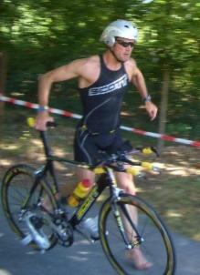 Beim Radfahren versuchte ich ersteinmal in Tritt zu kommen und nicht gleich voll loszufahren. Schnell hatte ich bereits auf der ersten von zwei Radrunden meine zwei Vereinskollegen Ekki und Ralf eingeholt. Chris Brader ebenfalls aus meinem Verein, der heute und auch die nächste Zeit so schnell nicht zu schlagen sein wird (dieses Jahr als Profi unterwegs), machte seiner Favoriten-Rolle alle Ehre und und zeigte uns in allen drei Disziplinen wo der Hammer hengt und gewann auch zum Ende den Wettkampf mit 6 Minuten Vorsprung vor dem zweitplatzierten (Hut ab !!!). Beim Radfahren wurde ich nach dem Schwimmen nur von Henning Fründt aus Hamburg überholt der sich mit der zweitbesten Radzeit weit nach vorne schob. Ansonsten ging ich als viertplatzierter auf die Laufstrecke. Die ersten drei Kilometer kam ich dann beim Laufen auch nicht so richtig in Schwung und konnte kaum Tempo machen. Der Knoten platzte erst bei Kilometer 5 nach der ersten Laufrunde, bis dahin war der drittplatzierte schon so weit von mir entfernt das keine Chance mehr bestand ihn einzuholen. So lief ich schlußendlich als viertplatzierter in Ziel und konnte mit dem Wettkampf auch nicht ganz zufrieden sein.