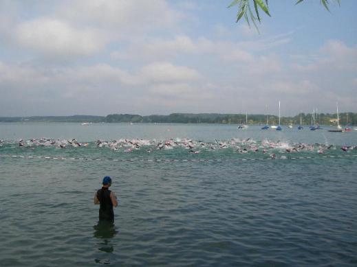 Über 300 Starter waren am Start und ich ging pünktlich um 08.40 Uhr mit der 2. Startgruppe auf den 1,5 Kilometer langen Rundkurs durch den Wörthsee. Zu beginn des Wettkampfes mußte ich aber heftig einstecken der ein oder andere Arm oder Fuß meiner Mitstreiter landete nicht im Wasser sondern mehrmals auf meinem Kopf, so daß ich ersteinmal versuchte zu "überleben" :-) ich fand dann jedoch einigermaßen meinen Weg in Richtung Land und stieg als 15. aus dem Wasser.