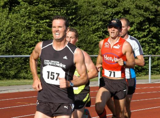 Am Donnerstag ging ich beim 5000 Meter-Lauf in der offenen Klasse an den Start. Die Favoriten standen fest und als Triathlet hatte ich mir keine Chancen auf die vorderen Plätze ausgerechnet. Erhoft hatte ich mir eine Platz unter den ersten 5 was ein Wunschergebniss für mich bedeutet hätte. So reihte ich mich nach dem Startschuß ersteinmal ziemlich hinten ein und war nach der 2 Runde auf Platz 13 liegend. Die Jungen wilden waren nach dem ersten Kilometer mal wieder alle viel zu schnell angegangen und ich ging so bei 3:27 über die 1 Kilometermarke. Danach zog ich das Tempo einwenig an und sammelte einen nach dem anderen ein und lag schon nach Kilometer 4 auf Platz 5 auf der letzten Runde kämpfte ich mit meinem Staffel-Kollegen Berni Lindner um den 4 Platz und konnte den Sprint ca. 200m vor dem Ziel für mich entscheiden und lief mit 17.09 Minuten über die Ziellinie. Was den 4. Gesamtplatz bedeutete. Ich war hoch zufrieden und ging damit sehr motiviert für die 3x1000 Meter Staffel am nächsten Tag an den Start.